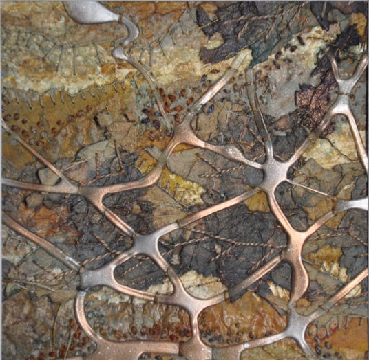 I have a developing interest in printing and text. The point of inspiration might be an image, a homemade stencil of an object, or a quote or phrase. I admire ancient texts and other languages, which, as I don’t necessarily understand the script or the meaning, become decorative pattern and line. I am intrigued by the way we remember parts of poems, quotes and prose and search our memories for the missing parts and have tried to demonstrate this in some of my work. I enjoy stitching text freehand and find it a very soothing pursuit. I am currently trying to use all those oddments of fabric, print and stitch trials in line with current thinking about the need to recycle.